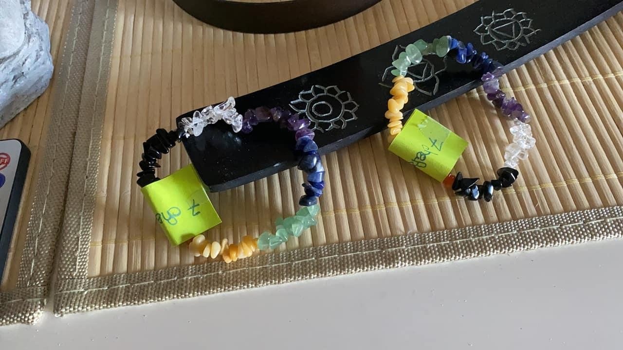 pierres : Obsidienne, Cornaline, Calcite jaune, Quartz vert, Sodalite, Améthyste et Cristal de roche