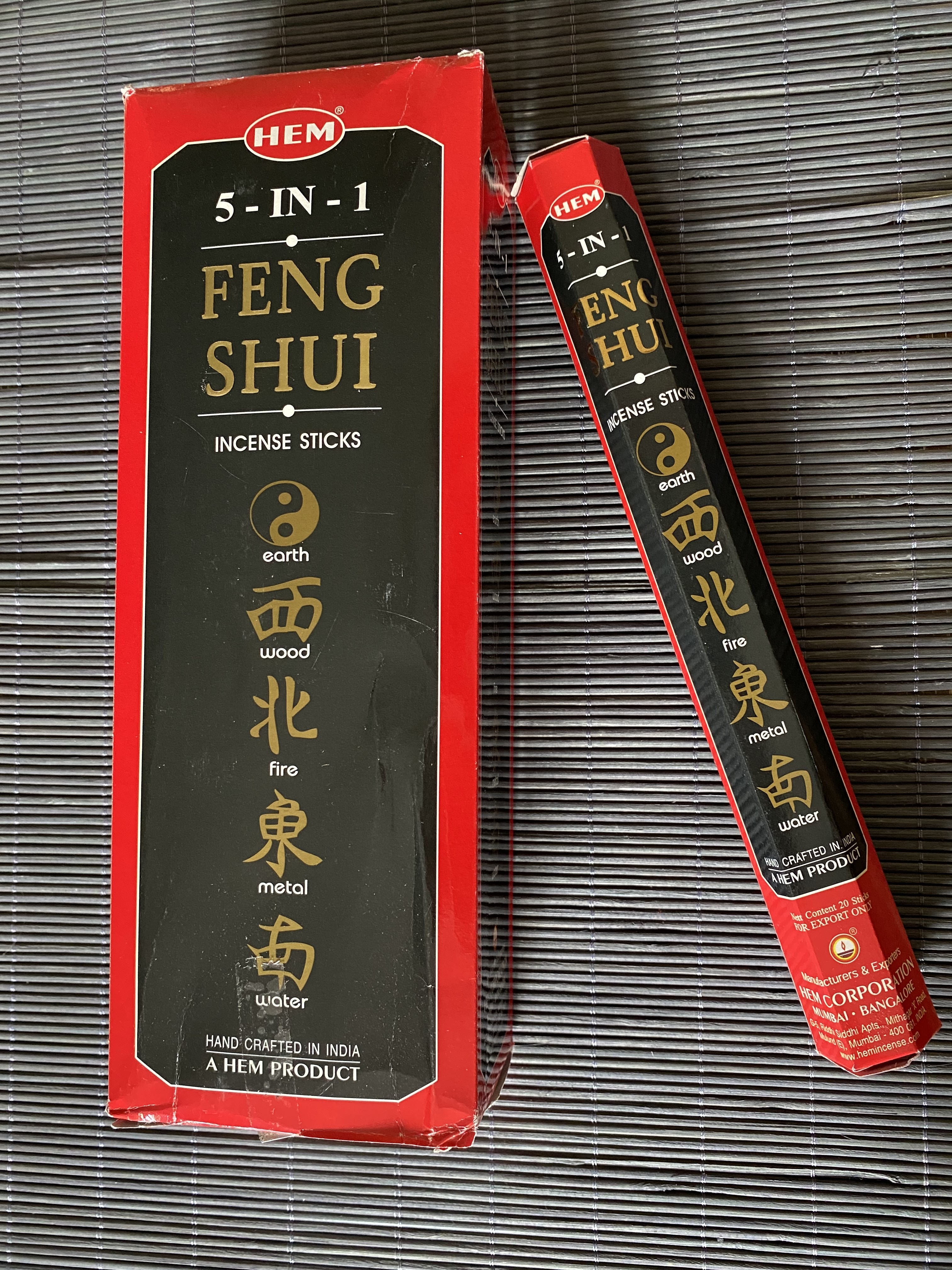 L'encens Hem Feng Shui réunit les cinq éléments (eau, feu, métal, bois et terre) pour créer l'harmonie parfaite. Pour être dans un bon Feng Shui, il faut comme chacun sait, que le Qi ou Chi soit fluide et puisse circuler en toute liberté et que cinq éléments les soient réunis dans les mêmes proportions dans les couleurs, les formes.