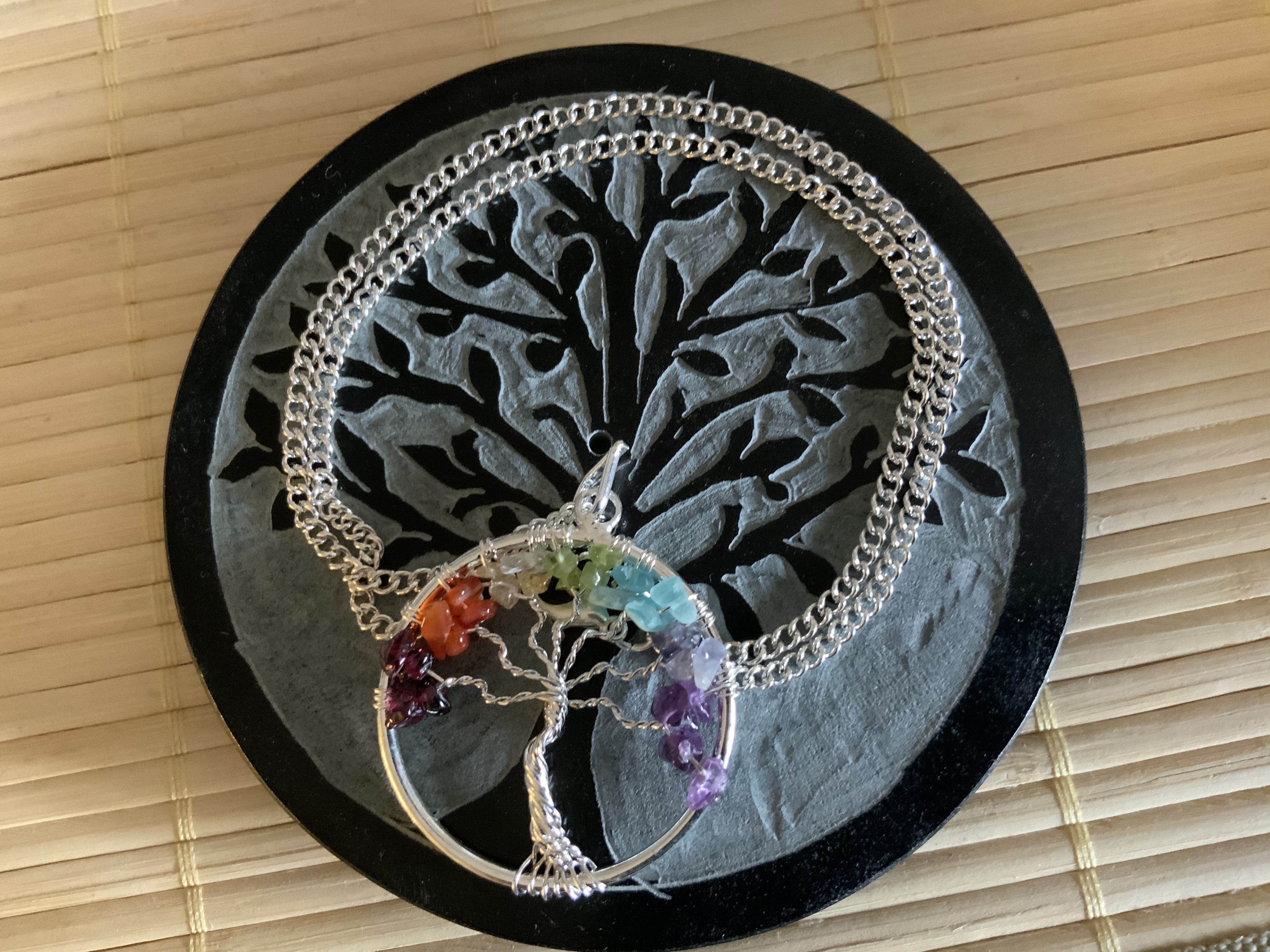 pierres : Obsidienne, Cornaline, Calcite jaune, Quartz vert, Sodalite, Améthyste et Cristal de roche